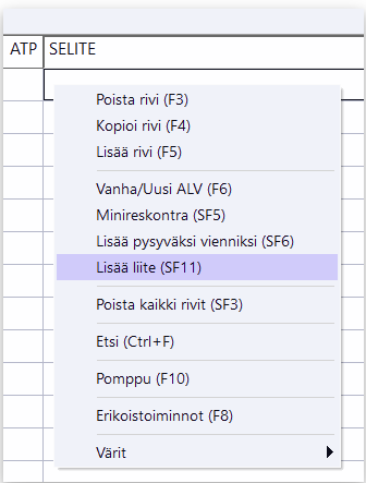 Liite viedään kirjanpidon tositteelle tositteen vientiriveillä hiiren oikeaa / Shift+F11-näppäinyhdistelmää klikkaamalla ja valitsemalla avautuvasta valikosta Lisää liite -toiminto. Liitteen voi lisätä myös F8:n erikoistoimintojen takaa. Jokaiselle vientiriville on mahdollista tallentaa oma tositeliite, eli yhdellä kirjanpidon tositteella voi olla joko yksi tai useita liitteitä.