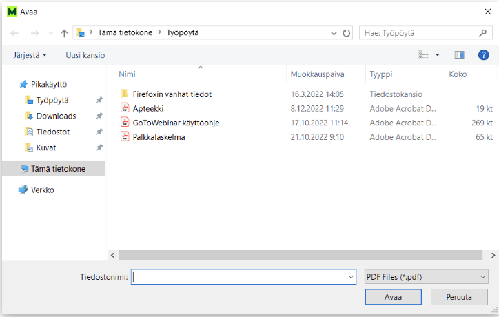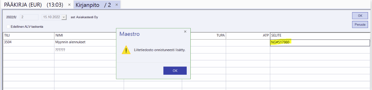 Tämän jälkeen käyttäjä voi valita oikean liitteen tietokoneensa resurssienhallinnan kautta. Ainoastaan pdf-muotoiset liitteet ovat sallittuja. Dokumentin valinnan jälkeen Maestro vie liitteen NG:lle ja lisää tositteelle NG#-alkuisen id:n.