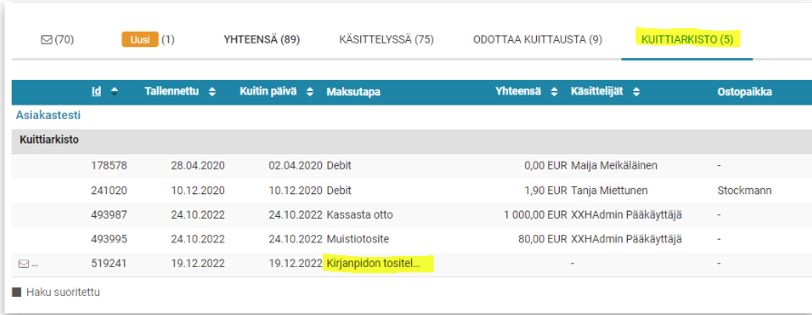 Kirjanpidon tositeliite löytyy MaestroNG:n kuittiarkistosta omalla maksutavallaan (Kirjanpidon tositeliite) merkittynä: