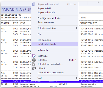 Tositeliite on mahdollista avata sekä pää- että päiväkirjaselauksilta klikkaamalla hiiren oikeaa ja valitsemalla sieltä NG-tositeliitteelle -toiminto.