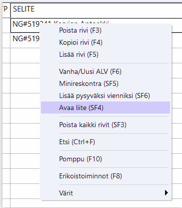 Tositeliitteen saa auki myös avaamalla tositteen kirjaustilaan, klikkaamalla vientiselite-kentässä hiiren oikeaa ja valitsemalla sieltä Avaa liite toiminto.