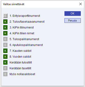 Tällä toiminnolla siirrät haluamasi tiedot Kirjanpidosta taulukkolaskentaan. Valitse siirrettävät tiedot merkitsemällä K rivin eteen.