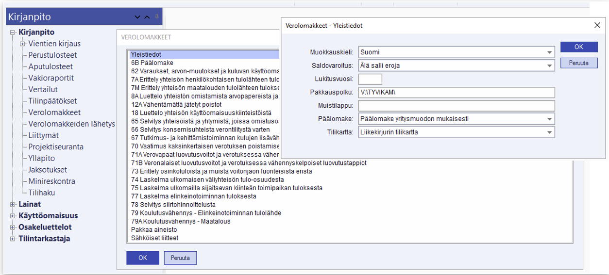 - Päälomake - Tässä valitaan mitä lomaketta käytetään päälomakkeena yrityksen yritymuodon mukaan. Esimerkiksi maatalouden tuloveroilmoitusta varten määritellään Lomake 2 - Maatalouden veroilmoitus, tai Lomake 2C - Metsätalouden veroilmoitus.