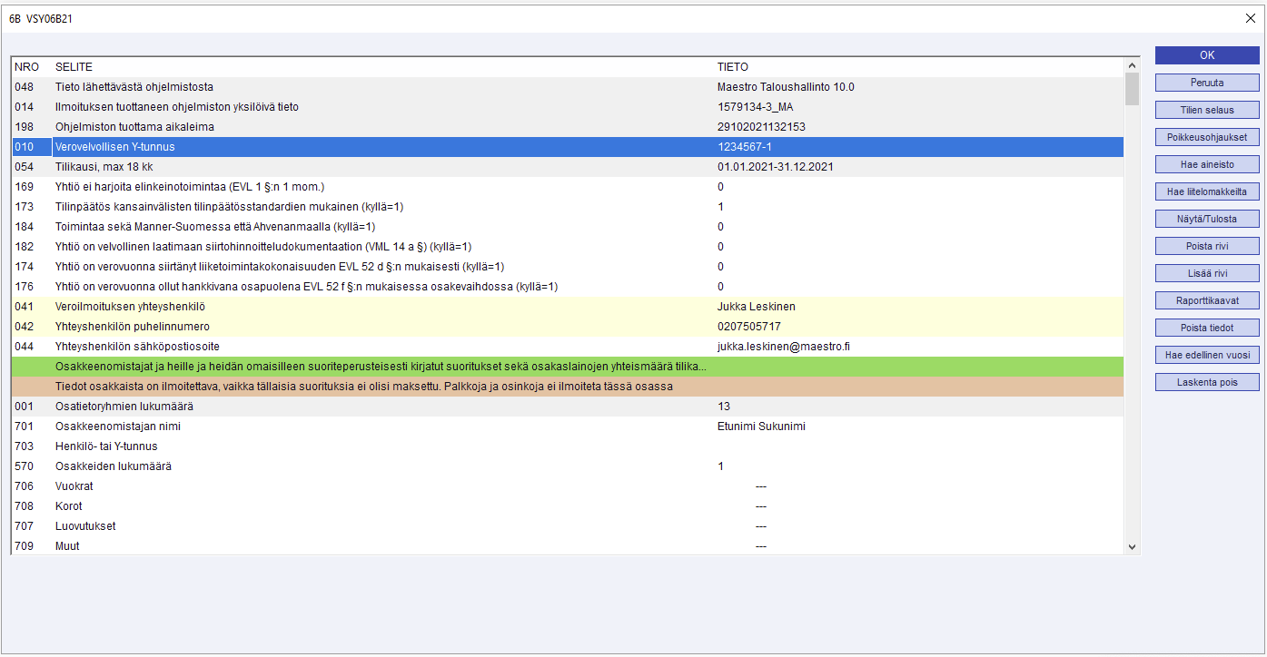 - Poista rivi ja Lisää rivi - Poistaa tai lisää osatietoryhmien lukumäärää. Tätä tarvitaan esimerkiksi silloin, kun osakkeenomistajia on enemmän kuin yksi. Saat poistettua rivin F3:lla tai valitsemalla Poista rivi. Uuden rivin voi lisätä F5:llä, tai valitsemalla Lisää rivi.