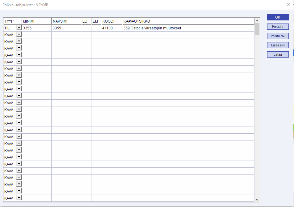 - Poikkeusohj. - Voit poikkeusohjata tili-, kaava- tai erikoisraportti numerovälin verolomakkeella. Kun valitset koodiksi 65535, ohjelma poistaa tilin kokonaan kaavakeräilyistä ja voit ohjata tilin haluttuun kenttään verolomakkeelle. Poikkeusohjaukset voit ladata toiselta firmalta F8-näppäimellä.