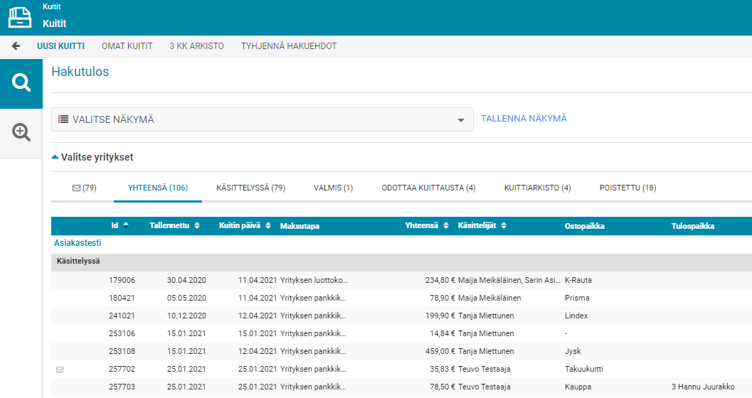 Tee hakurajaukset ja klikkaa 'Hae' hakuehtojen alareunasta. Kuittilista päivittyy hakuehtojesi mukaisesti.