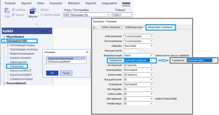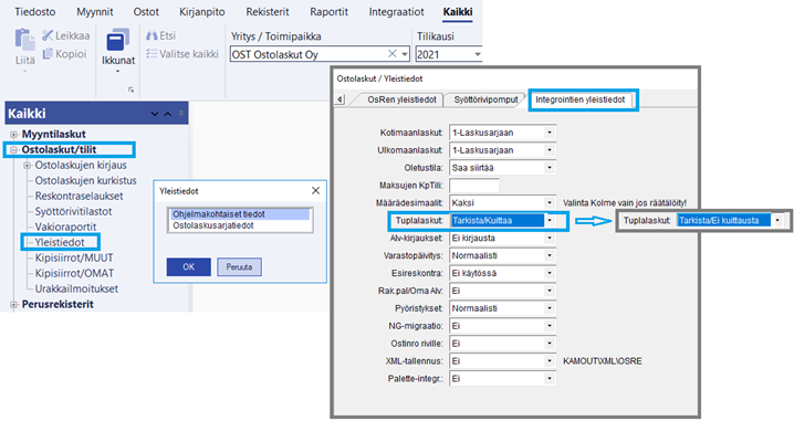 - Muuta Maestrossa ostolaskujen Yleistiedoissa Tuplalaskut –asetus arvoon ”Tarkasta/Kuittaa”
