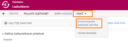 Saat siirrettyä kerralla kaikki laskut Valmis välilehdelle valitsemalla ostolaskujen kiertolistalla yrityksen laskut ja klikkaamalla MUUT –valikosta Siirrä kuittausta odottavat valmiiksi.