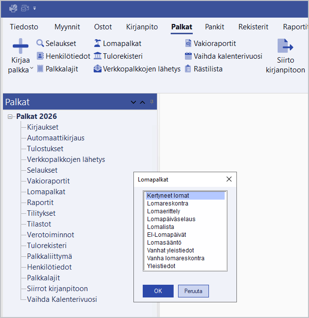 Kertyneet lomat -toiminnolla saat tulosteen palkansaajien lomapäivistä, lomapalkasta ja lomarahasta yhdeltä lomavuodelta. Kun maksupäivärajaus on lomamääräytymisvuosi - yleensä huhtikuun alusta maaliskuun loppuun, esimerkiksi 1.4.2025 - 31.3.2026, ja kun ei ole muita rajauksia (kuten henkilörajaus), ohjelma kysyy tallennetaanko tiedot lomareskontraan (1.4.2025 - 31.3.20216 taltioi vuoden 2026 lomareskontraan).