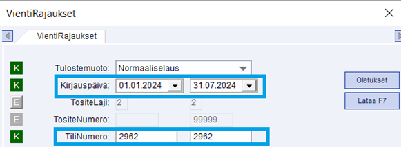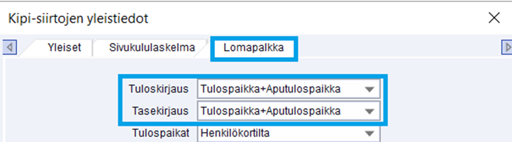 (Palkat > Siirrot kirjanpitoon > Yleistiedot > Lomapalkka –välilehti)