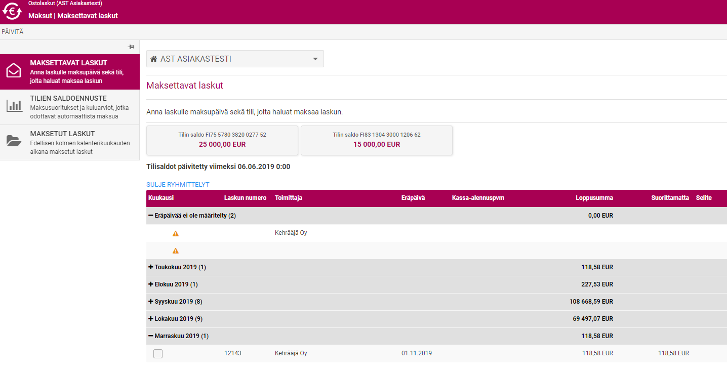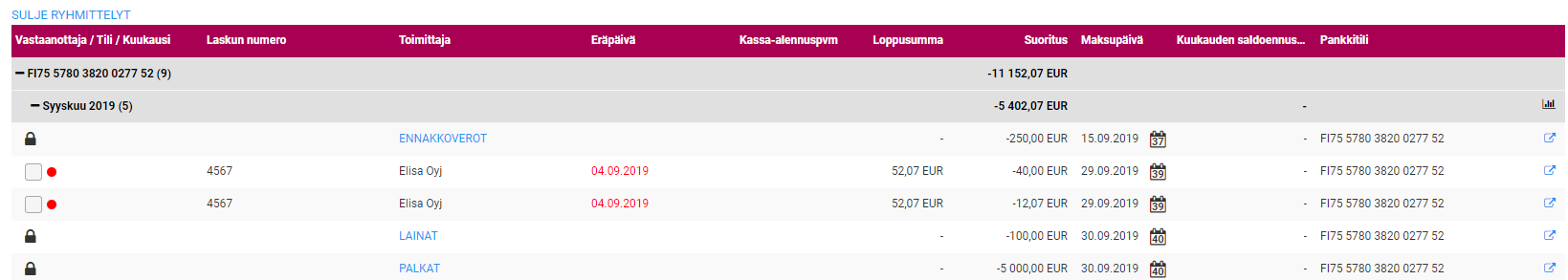 Maksettavat laskut on ryhmitelty kuukausittain eräpäivän mukaan. Voit avata ja sulkea ryhmittelyjä ja tarkastella esimerkiksi vain yhden kuukauden laskuja kerrallaan. Näet tilien saldot sekä kaikki maksettavat laskut kuukauden mukaan ryhmiteltynä.