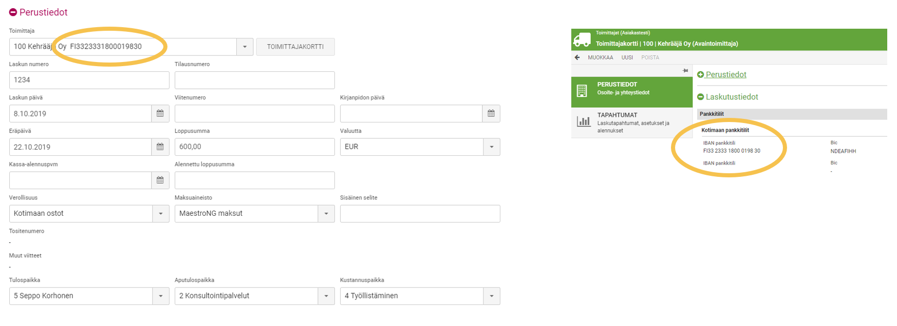 | Toimittaja | Toimittajan tiedoissa on oltava kotimaan IBAN pankkitili (johon lasku maksetaan) |