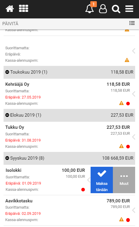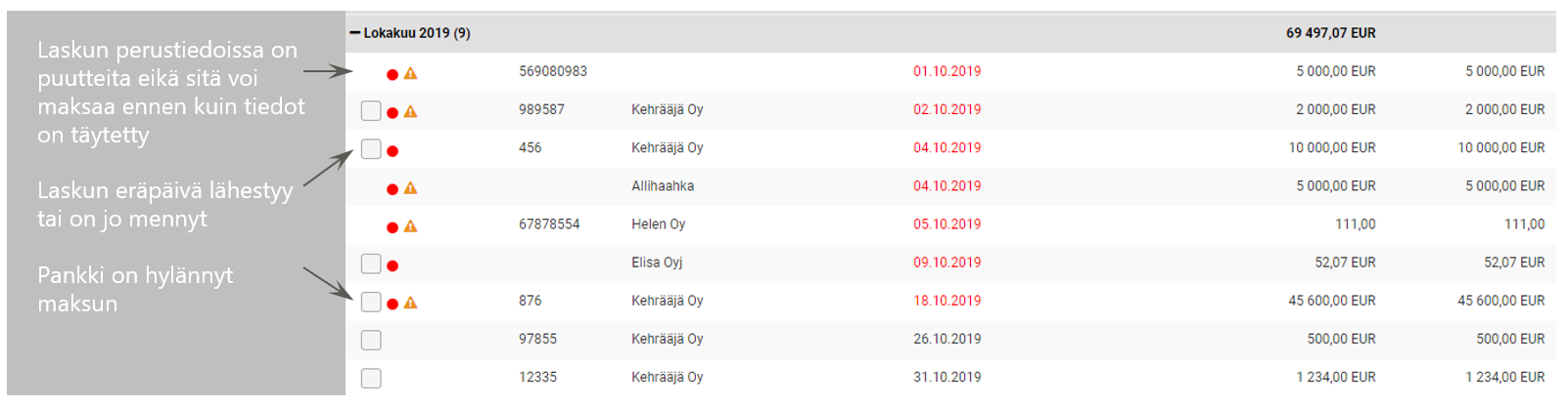 - Jos laskun kohdalla näkyy punainen pallo, laskun eräpäivä on lähellä tai jo mennyt.