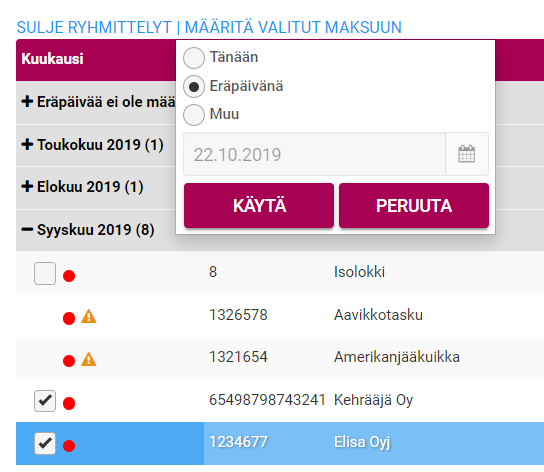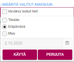 Voit maksaa valitsemasi laskut joko heti tänään, eräpäivänä ja muuna päivänä. Maksut suoritetaan oletustililtä. Valitse Määritä valitut maksuun ja valitse maksupäivä.