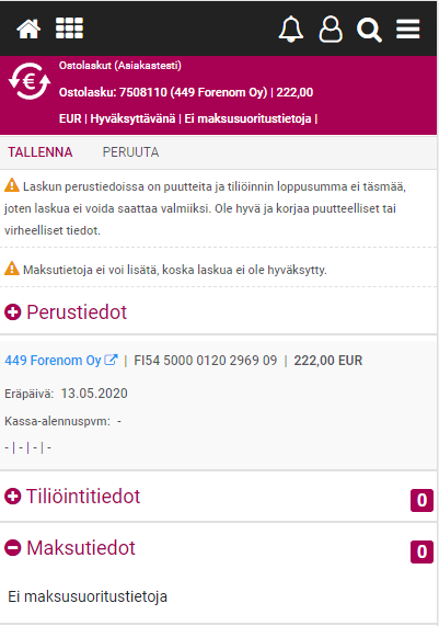 - Jos laskun perustiedoista puuttuu maksamiseen liittyviä tietoja, esimerkiksi toimittajalla ei ole tiliä, et voi lisätä maksutietoja. Täydennä ensin perustiedot.