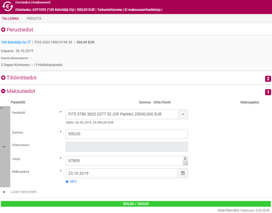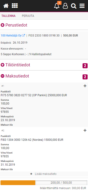 Tässä esimerkissä laskua maksetaan kahdessa erässä kahdelta tililtä eri maksupäivinä. Laskusta jää vielä maksamatta 300 EUR. Ostolasku on nyt määritetty maksuun. Maksupäivän mukaisesti, laskua maksetaan joko heti, muuna päivänä tai eräpäivänä. Maksutapahtuma siirtyy pankki vasta maksupäivänä, joten voit vielä halutessasi muokata antamiasi maksutietoja.