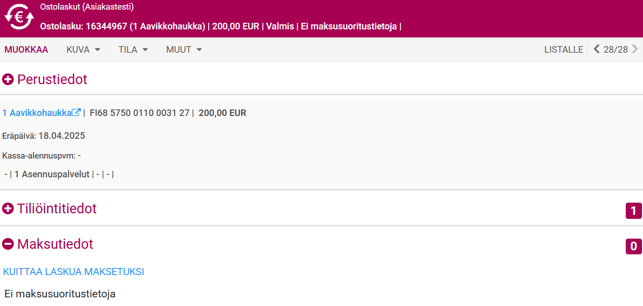 Laskun maksutietoihin tulee merkintä ja lasku näkyy maksettuna.