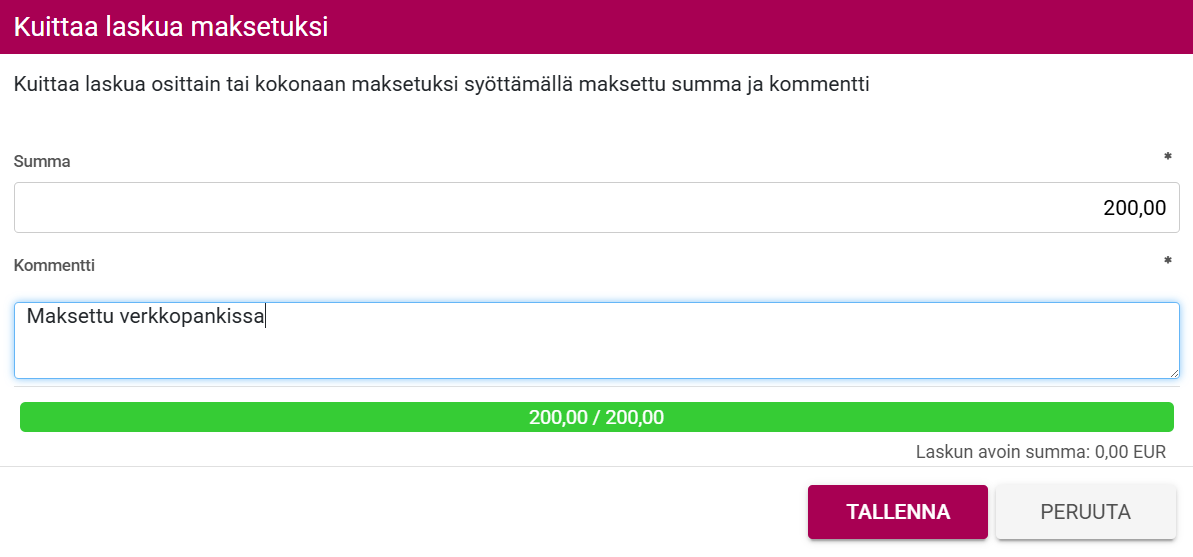 | 2. Laskusta maksetaan vain osa | Luo laskulle maksutieto ja merkitse lasku sen jälkeen maksetuksi. Maksu menee normaalisti pankkiin ja kun se kuittautuu maksetuksi (tiliotteelta), lasku tulee näkyviin maksetut laskut -listalle |