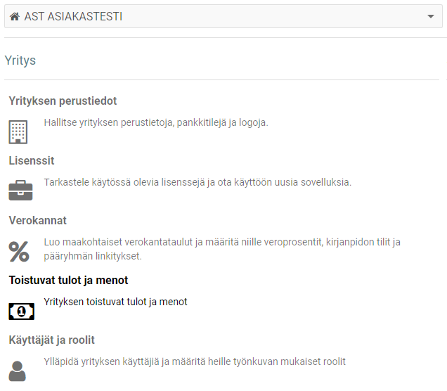 Voit lisätä säännöllisiä, laskennallisia vakiomenoja tilien saldoennusteeseen. Nämä ovat kuluja, jotka maksetaan muuta kautta esimerkiksi Maestro Taloushallinnosta, suoraveloituksena tai vaikkapa suoraan verkkopankista. Toistuvat menot määritellään yrityksen asetuksissa. Valitse päävalikosta Asetukset. Tarkasta, että valittuna on oikea yritys ja valitse Toistuvat tulot ja menot.