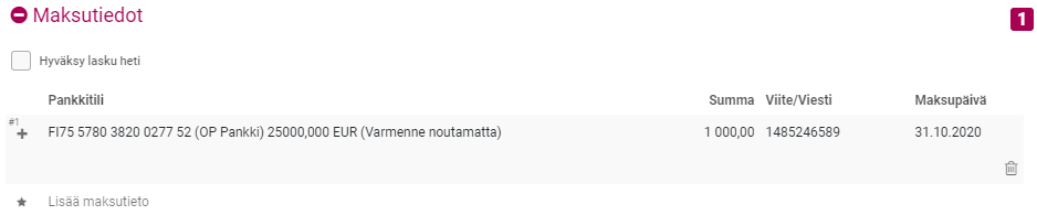 - Jos laskulla on viitenumero, se tulee maksun viitteeksi