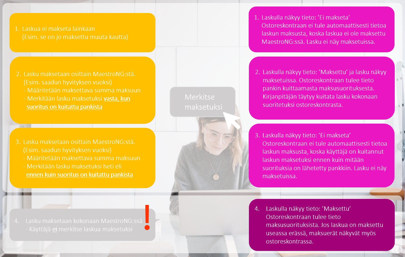 Jos laskua ei makseta lainkaan MaestroNG:stä tai se maksetaan vain osittain (esim. toimittajalta saadun hyvityksen vuoksi), se merkitään maksetuksi. Tällöin lasku ei enää näy maksettavissa laskuissa. Katso alla olevasta kuvasta, kuinka 'Merkitse maksetuksi'-toiminto toimii eri tilanteissa.