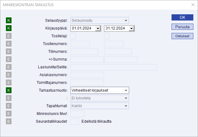 - Virheelliset kirjaukset - Tulostuu vain joko kirjanpidossa tai minireskontrassa olevat kirjaukset.