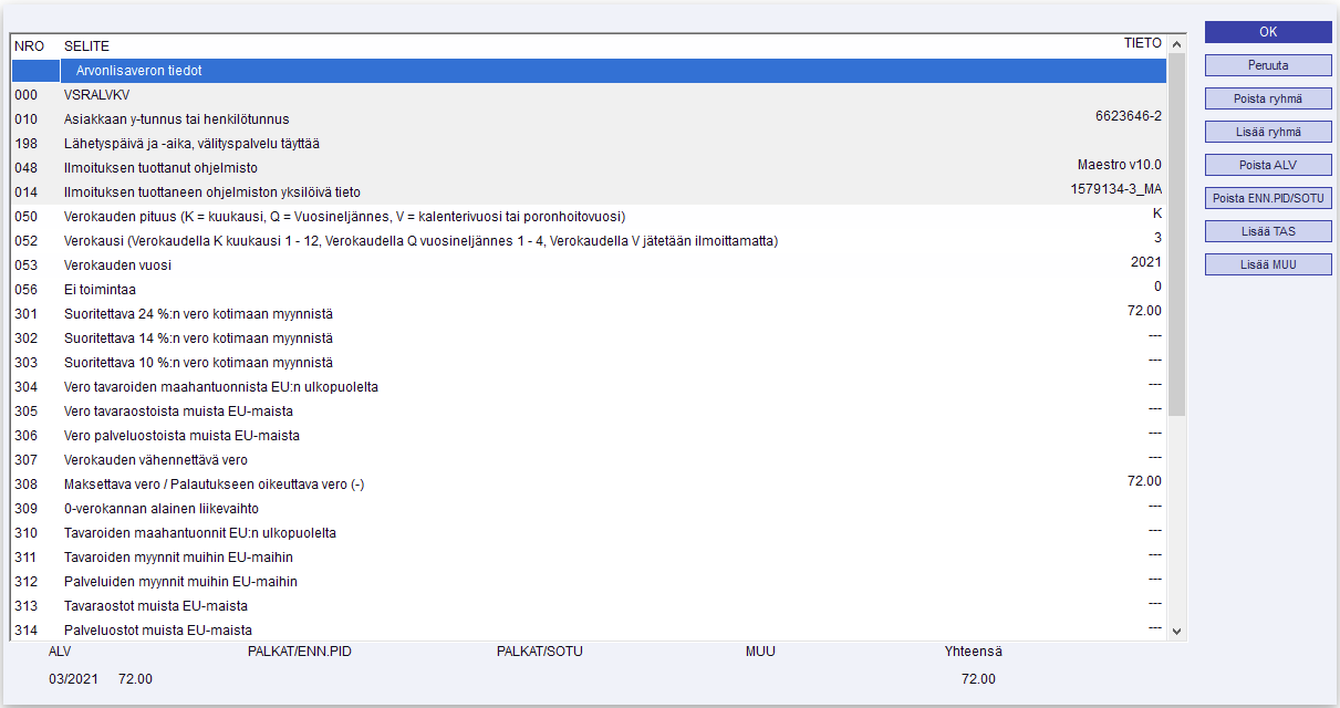 | Poista ALV | Kun aktivoit jonkun VSRALVKV-tietorivin, tällä valinnalla muokkausruudulta poistaa arvonlisäveron tiedot, joten ne jäävät pois myös OmaVeroilmoitukselta. Myös Shift + F7. |