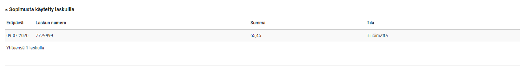Sopimuksella näkyy lista laskuista, joita on käsitelty tähän sopimukseen perustuen.