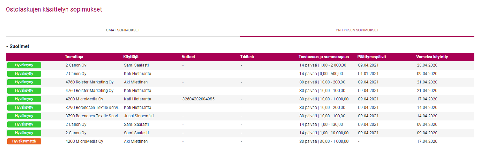 Jos sopimusrivillä on tagi ’Hyväksytty’, sopimus on hyväksytty ja se on käytössä. ’Hyväksymättä’ -tagilla merkityt sopimukset odottavat käsittelijän hyväksymistä ennen kuin ne tulevat käyttöön.