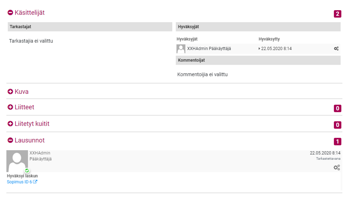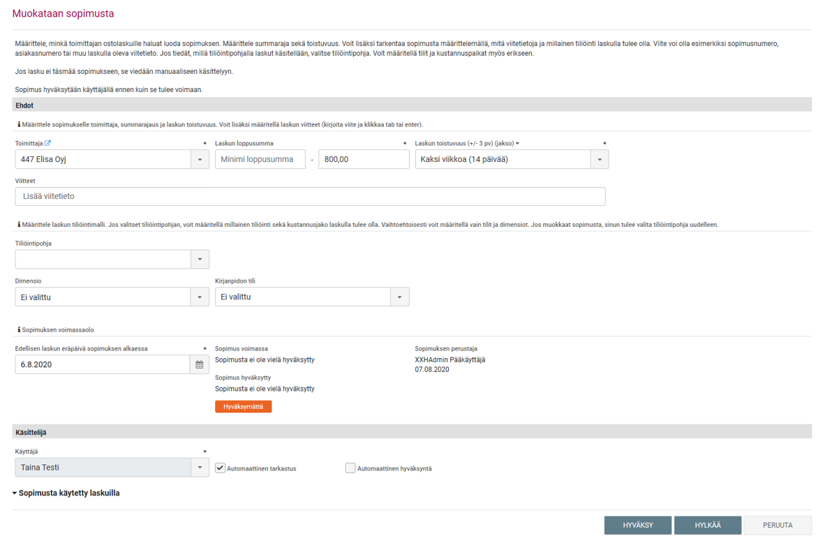 - Pääkäyttäjä on luonut sopimuksen lehtilaskun hyväksymiseen.