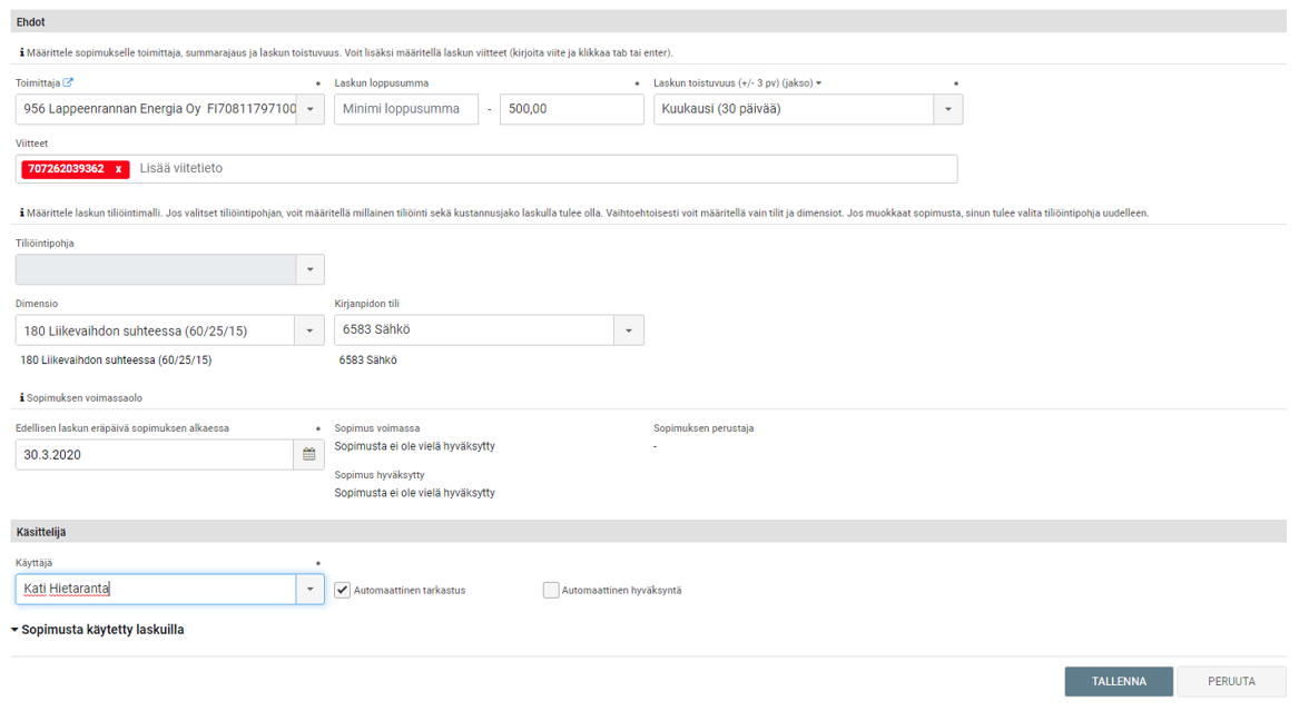 Jos määrittelet sopimukseen vain pakolliset tiedot, tarkoittaa tämä sitä, että kaikki kyseisen toimittajan alle maksimisummaiset, esimerkiksi 30 päivän välein toistuvat laskut käsitellään automaattisesti. Jos sama toimittaja lähettää eri aiheeseen liittyviä laskuja, voit tarkentaa sopimusta muilla ehdoilla. Voit myös määritellä, millainen tiliöinti, kustannuspaikat tai kustannusjako laskulla tulee olla. |