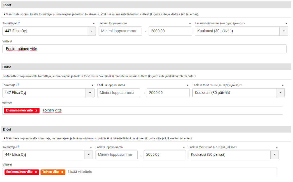 Sopimuksen voimassaolopäivä tulee näkyviin vasta kun sopimus on hyväksytty. Sopimuksen viitteet näkyvät käyttöliittymässä tagina. Viite voi sisältää kirjaimia, numeroita ja välilyöntimerkkejä. Kirjoita koko viite ja paina TAB tai Enter.
