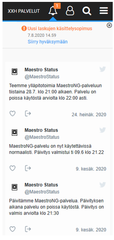 Jos pääkäyttäjä on tehnyt puolestasi sopimuksen laskun automaattista käsittelyä varten, sinun tulee hyväksyä sopimus. Sopimusta ei käytetä automaattisessa käsittelyssä, jos siihen liittyvä käsittelijä ei ole hyväksynyt sitä. Kun kirjaudut MaestroNG-palveluun, yläpalkin kellokuvakkeessa näkyy viesti uudesta ilmoituksesta. Voit avata viestin etusivulta ja myös silloin, kun sinulla on jokin sovellus - esimerkiksi Ostolaskujen käsittely - auki. Klikkaamalla kellokuvaketta, saat viestiruudun auki. Siirry hyväksymään uusi sopimus valitsemalla Siirry hyväksymään.