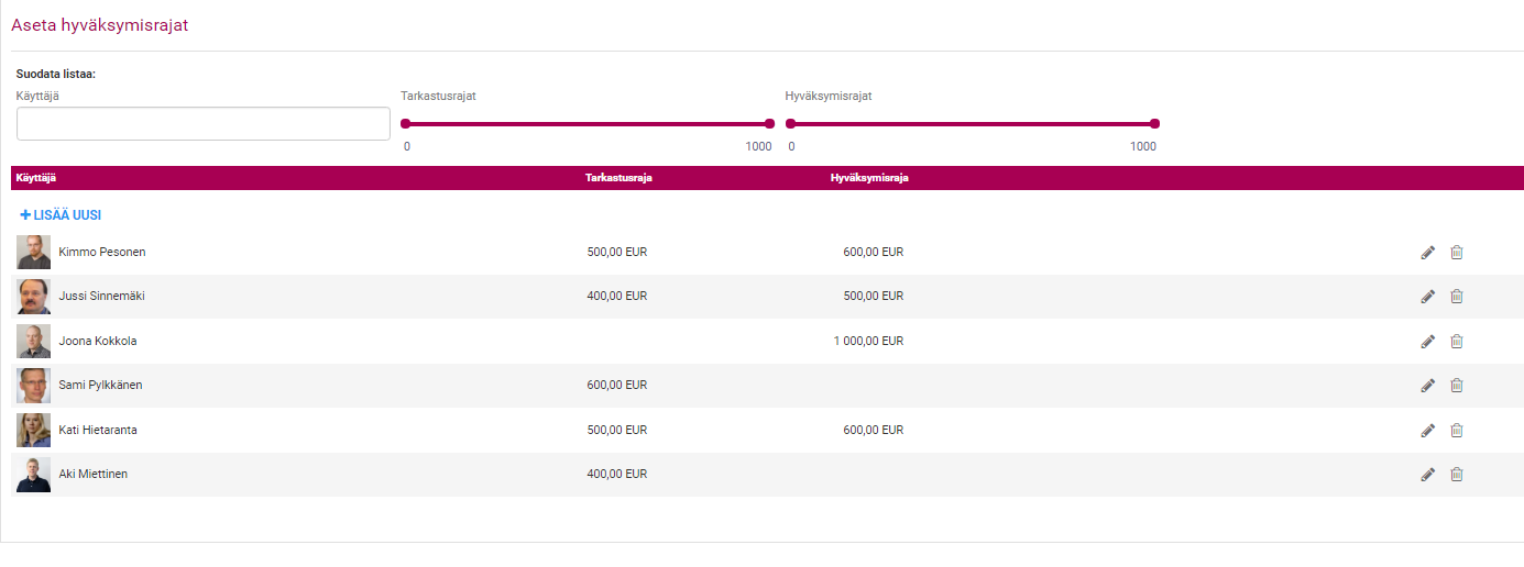 Lisää uusi käsittelyrajasääntö valitsemalla Lisää uusi. Tallennettu käsittelyraja on voimassa uusille laskuille, ja rajan asettaminen ei vaikuta kierrossa oleviin laskuihin. Käsittelijävalinnassa näytetään harmaalla tekstillä niitä käyttäjiä, joiden käsittelyraja ylittyy eikä näitä käyttäjiä voi valita laskun käsittelijäksi.