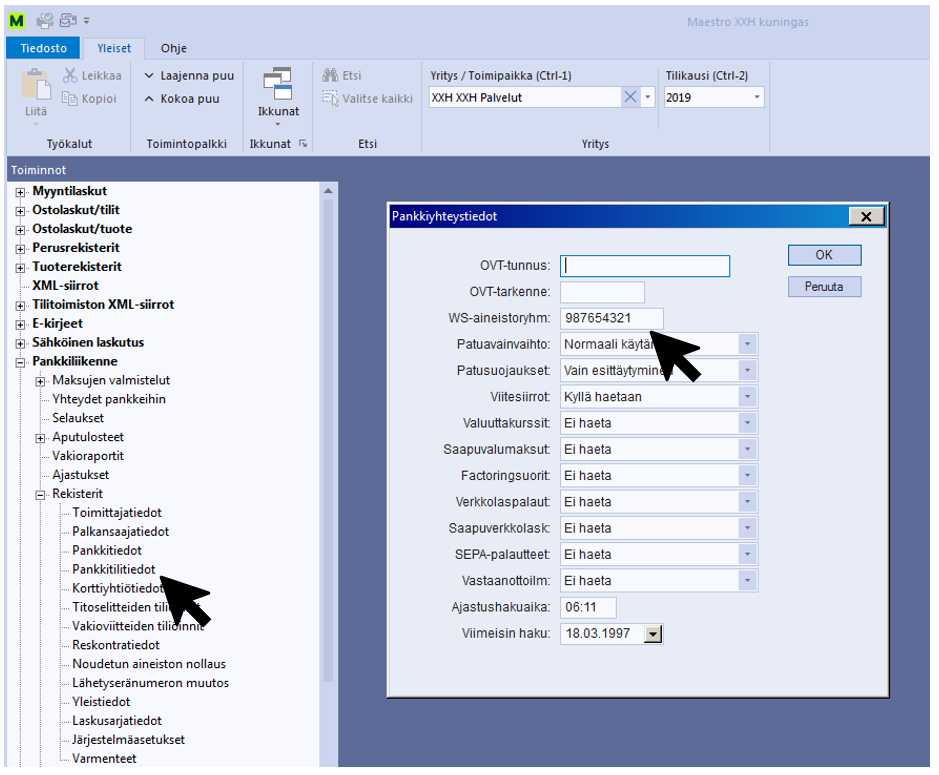 Maksut lähetetään pankkiin MaestroNG:stä, joten siirtoa varten on oltava käytössä WS-aineistoryhmän tunnus niillä pankeilla, jotka sitä käyttävät - esimerkiksi Nordea. Jos tilitoimiston asiakkaat käyttävät tilitoimiston pankkiyhteyttä, WS-aineistoryhmän tunnukset asetetaan vain kertaalleen käyttöön tilitoimistokohtaisesti. WS-aineistoryhmän tunnus on pankkiyhteyskohtainen. Jos tilitoimiston asiakkaalla on oma pankkiyhteys, on WS-aineistonryhmän tunnus asetettava asiakkaan pankkiyhteyden tietoihin.