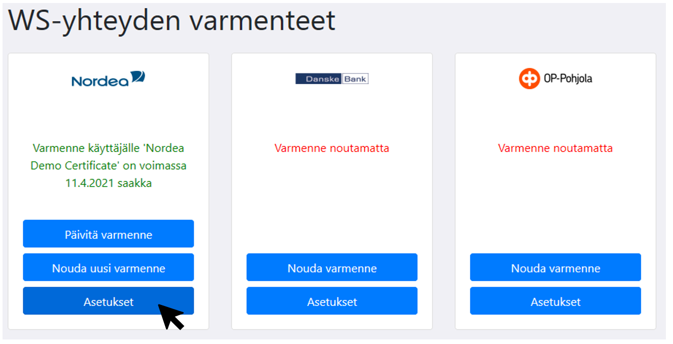 Valitse Maestro Taloushallinnossa tilitoimiston pankkiyhteysyrityksen Pankkiliikenne -sovelluksesta Rekisterit/Varmenteet. Jos tilitoimiston asiakas käyttään omaa pankkiyhteyttä, sinulla tulee olla valittuna asiakasyrityksen tiedot. Varmenne -näkymä avautuu selaimeen. Valitse pankkikohtaiset Asetukset. Tallenna WS-aineistoryhmän tunnus.