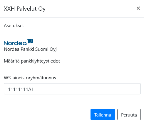 Tässä esimerkissä 'XXH Palvelut Oy' on tilitoimistoyritys, jolla on pankkiyhteys. Malliyritys Oy on tilitoimiston asiakas, jolle käyttöönotetaan maksatusta. Tämä on avain, jolla määritellään, minkä yrityksen pankkiyhteyttä maksamisessa käytetään.