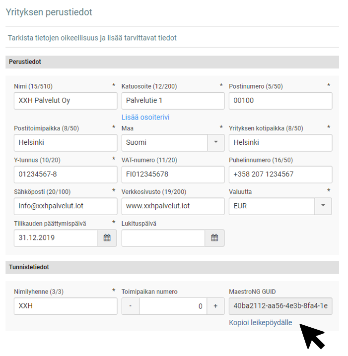 Tarvitset käyttöönoton jälkeen yrityksen pankkitiliasetuksiin pankkiyhteysyrityksen aktivointikoodin GUIDin. Voit kopioida sen valmiiksi talteen. Valitse päävalikosta Asetukset. Valitse yritysvalikosta pankkiyhteysyritys. Valitse yrityksen perustiedot. Kopioi tunnistetiedoista leikepöydälle MaestroNG GUID.
