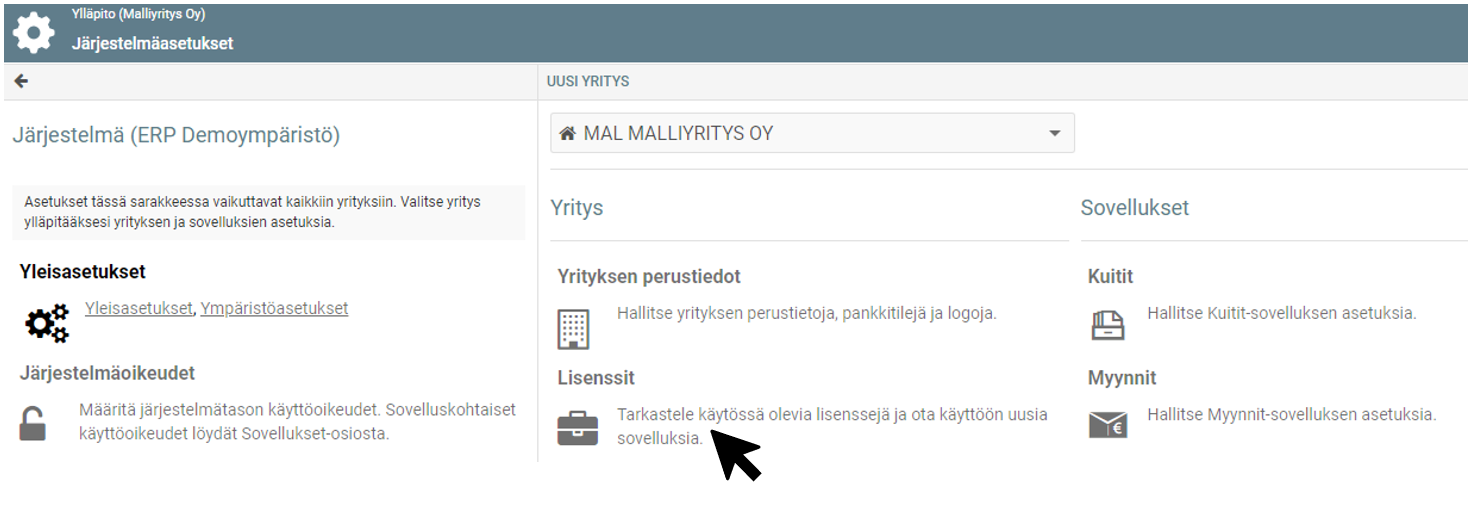 Tässä esimerkissä maksatusta asennetaan Malliyritys Oy:lle.