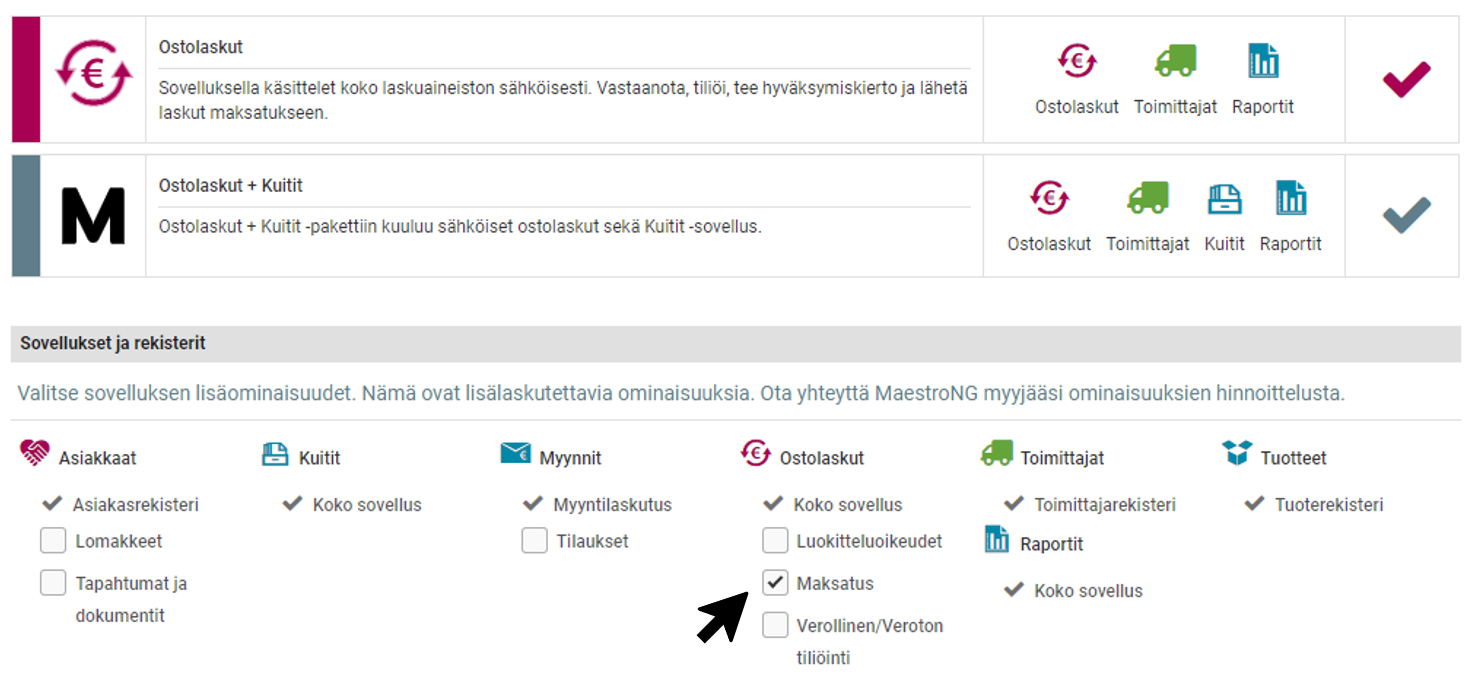 Maksatus-ominaisuuden käyttöönotto