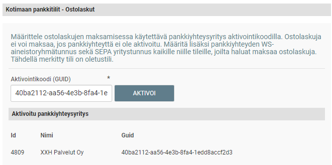 Kun maksatus-ominaisuus on käyttöönotettu, näkyy yrityksen perustiedoissa Ostolaskuihin liittyvät kotimaan pankkitilit. Valitse Yrityksen perustiedot ja liitä aiemmin kopioimasi aktivointikoodi GUID Kotimaan pankkitilit/Ostolaskut -osaan. Valitse Aktivoi. Aktivoitu pankkiyhteys tulee näkyviin pankkitilitietoihin. MaestroNG käyttää nyt tätä pankkiyhteyttä maksujen lähettämiseen.