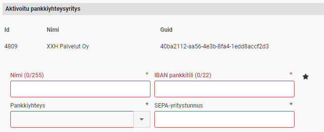 Kun pankkiyhteys on aktivoitu, voit tallettaa ne pankkitilit, joita käytetään ostolaskujen maksuun. Kirjoita Nimi-kenttään pankkitilin nimi. Tämä on pankin nimi, joka näkyy sinulle maksuja tehdessä. Kirjoita IBAN-muotoinen tilinumero sille varattuun kenttään. Valitse Pankkiyhteys-valikosta pankki. Kirjoita yrityksen SEPA-yritystunnus sille varattuun kenttään.