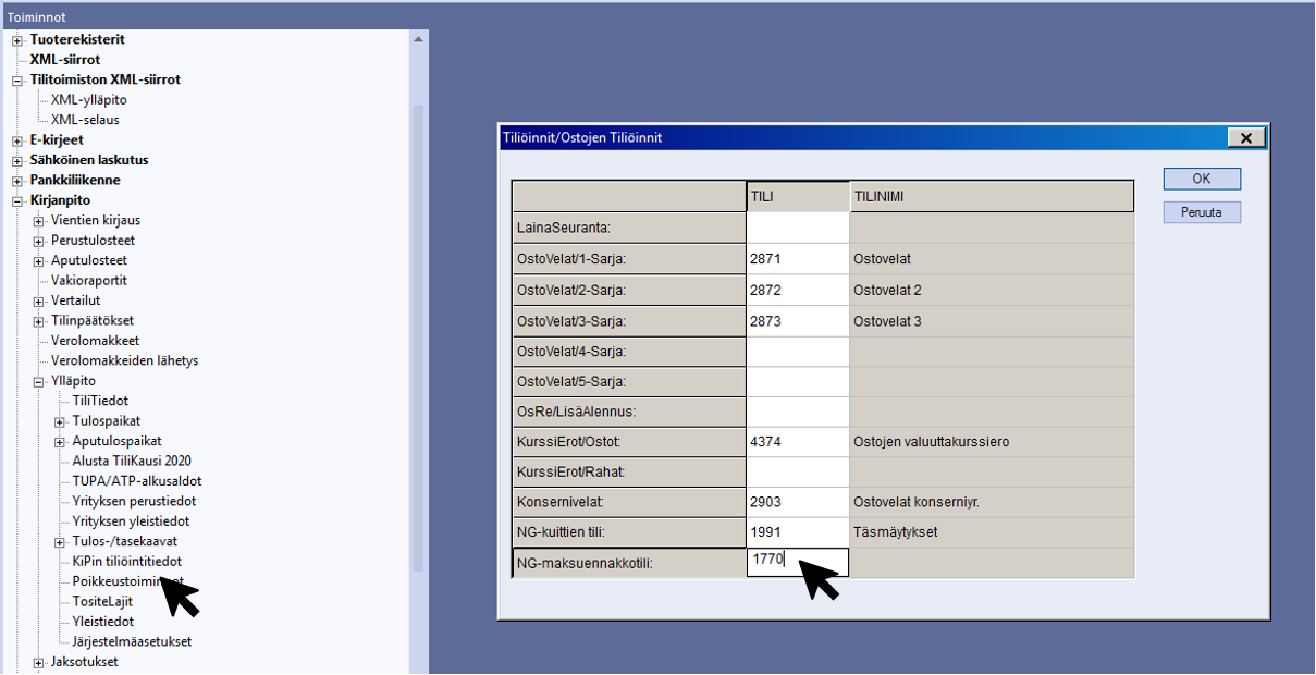 Avaa kirjanpidon ylläpidon kautta Ostojen tiliöinnit ja tallenna sopiva NG-maksuennakkotili.