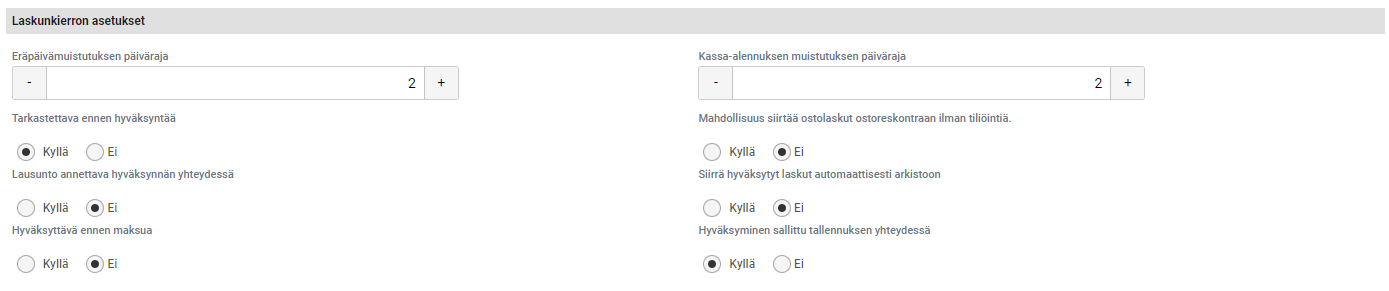 - Aseta tarvittaessa päälle asetus, ettei laskua voi maksaa ennen kuin siinä on vähintään yksi hyväksymismerkintä