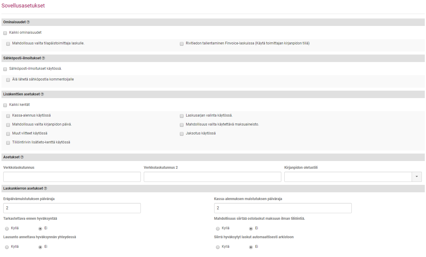 Sovellusasetukset ovat yrityskohtaisia asetuksia. Avaa sovelluksen asetukset päävalikosta valitsemalla Ostolaskut/Asetukset.