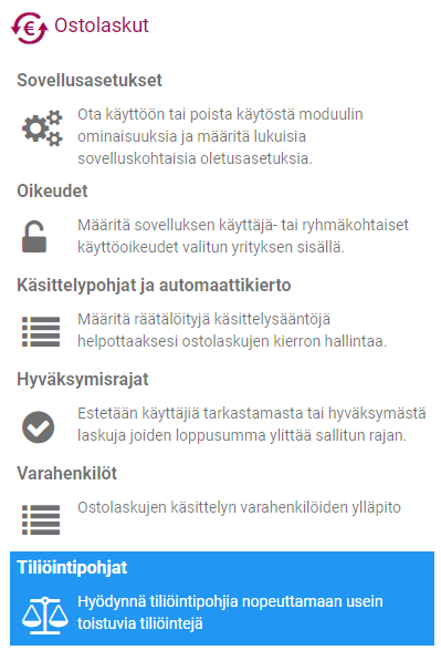 Tiliöintipohjia pääset luomaan ja muokkaamaan ostolaskujen asetuksista. Tiliöintipohjat näkyvät käyttäjillä, joilla on oikeus ylläpitää ostolaskujen asetuksia.