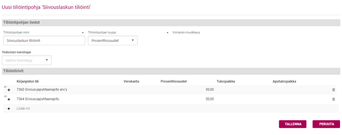 - Prosenttiosuudet: Laskun loppusumma jaetaan prosenttiosuuksittain määritellyille tileille.