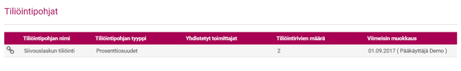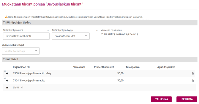 Pääset muokkaamaan olemassa olevia tiliöintipohjia klikkaamalla tiliöintipohjalistalta riviä. Jos tiliöntipohjaa käytetään käsittelypohjassa ja/tai automaattikierrossa, huomauttaa sovellus tästä. Tarkasta tällöin, voitko muokata tätä pohjaa.