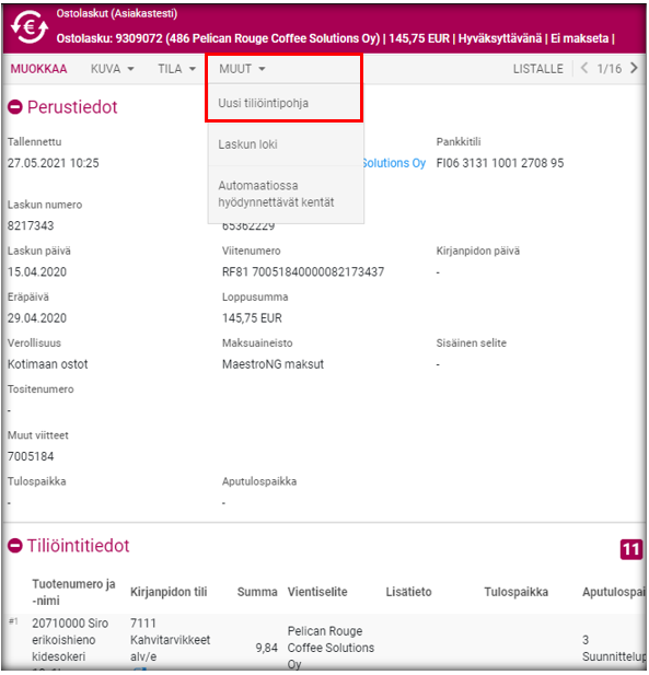 Tiliöintipohjan voi luoda myös tiliöidyltä ostolaskulta. Tiliöintipohja linkittyy tällöin laskulle valittuun toimittajaan siitä tulee 'Avoimet rivisummat'-tyyppinen: tallennetussa pohjassa on tällöin mukana toimittaja, tilit sekä kustannuspaikat, mutta ei summia tai prosenttiosuuksia. Voit muokata pohjaa heti luotuasi sen esimerkiksi toisen tyyppiseksi, tai muokata sitä tarvittaessa myöhemmin. Valitse tiliöidyltä laskulta MUUT - Uusi tiliöntipohja.