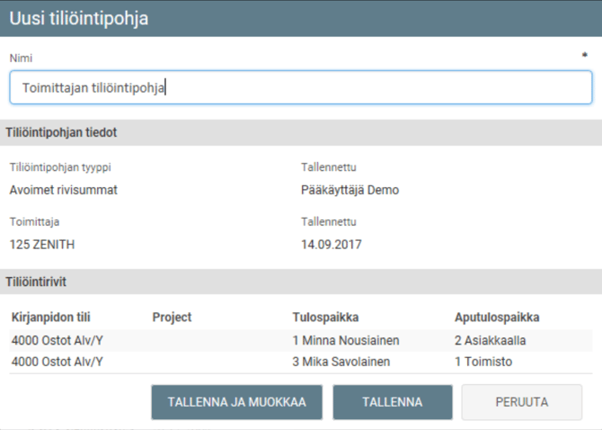 Anna tiliöintipohjalle kuvaava nimi ja valitse Tallenna. Tiliöintipohja tallentuu kyseisen yrityksen tiliöintipohjiin ja saat sen auki asetuksien kautta. Jos haluat samantien muokata pohjaa, valitse Tallenna ja muokkaa. Tiliöintipohja avautuu tällöin muokattavaksi. Pääse takaisin laskulle valitsemalla Palaa.
